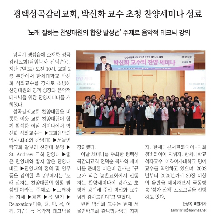 ÆòÅÃ½Ã ÆØ¼ºÀ¾¿¡ ¼ÒÀçÇÑ ¼º°î°¨¸®±³È¸(´ãÀÓ¸ñ»ç Àü´ö¼ø)´Â Áö³ 7ÀÏ(Åä) ¿ÀÀü 10½Ã, ±³È¸ 2Ãþ º»´ç¿¡¼ ÇѼ¼´ëÇб³ ¹Ú½ÅÈ ¼®Á±³¼ö¸¦ °»ç·Î ÃʺùÇØ Âù¾ç´ë¿øÀÇ ¿µÀû ¼ºÀå°ú À½¾ÇÀû Å×Å©´ÐÀ» À§ÇÑ Âù¾ç¼¼¹Ì³ª¸¦ °³ÃÖÇß´Ù.
