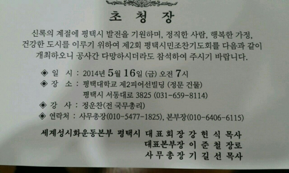 ¿À´Â 2014³â 5¿ù16ÀÏ(±Ý)¿ÀÀü 07½Ã ÆòÅýà ¼µ¿´ë·Î 3825 ÆØÅôëÇб³ Á¦2ÇǾºôµù(Á¤¹®ºôµù)¿¡¼ ÆòÅýà ¼º½ÃÈ ¿îµ¿º»ºÎ(´ëǥȸÀå °Çå½Ä¸ñ»ç. »ç¹«ÃÑÀå ±â±æ¼±¸ñ»ç. º»ºÎÀå ÀÌÁØÃ¶Àå·Î) ÁÖÃÖ·Î Á¦2ȸ ÆòÅýùΠÁ¶Âù±âµµÈ¸¸¦ °³ÃÖÇÑ´Ù.