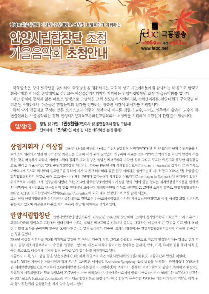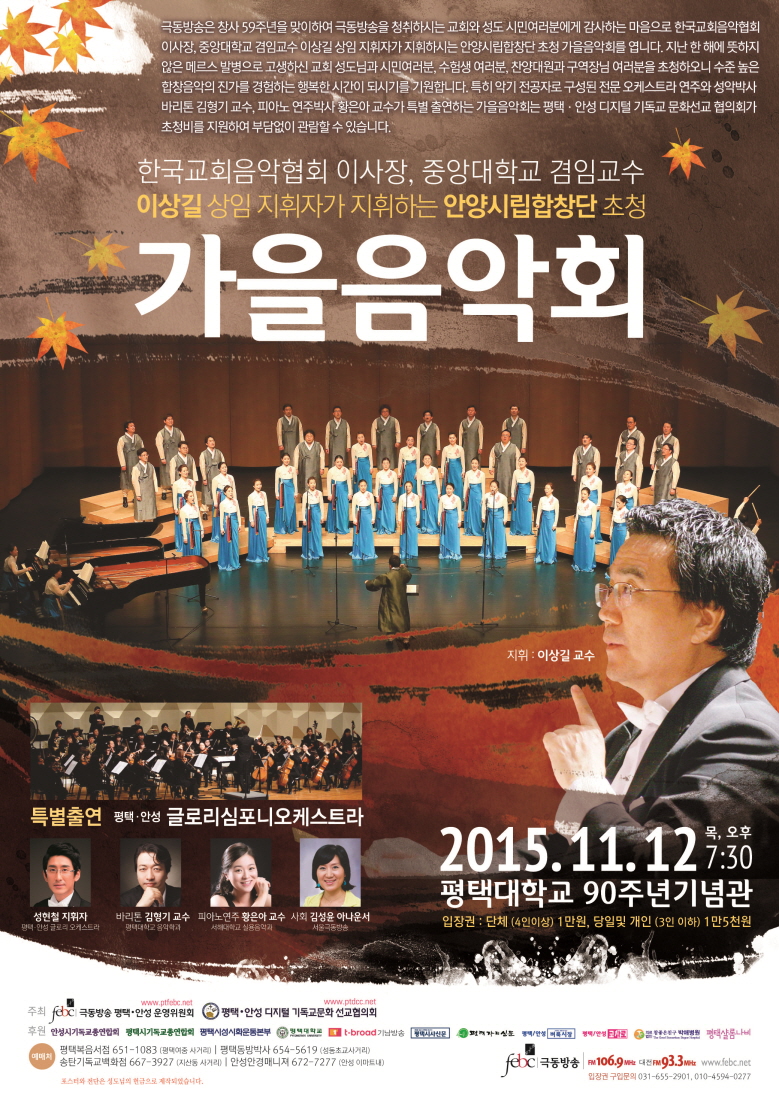 ¼¿ï±Øµ¿¹æ¼Û ±è¼ºÀ± ¾Æ³ª¿î¼ »çȸ·Î 1½Ã°£ 30ºÐ µ¿¾È ÁøÇàµÇ´Â °¡À»À½¾Çȸ´Â °æ±â ³²ºÎÁö¿ª ½Ã¹Î°ú ÃæÃ» ºÏºÎÁö¿ª ½Ã¹Îµé¿¡°Ô ¼öÁØ ³ôÀº ÇÕâ À½¾Ç¹®È¸¦ Á¦°øÇϱâ À§ÇØ ¼¼°èÀûÀÎ ÇÕâÁöÈÖÀÚÀ̸ç Çѱ¹±³È¸À½¾Ç ÀÌ»çÀåÀÎ ÀÌ»ó±æ ±³¼ö°¡ ÁöÈÖÇÏ´Â ¾È¾ç½Ã¸³ÇÕâ´Ü(»óÀÓÁöÈÖÀÚ: ÀÌ»ó±æ±³¼ö) ÃÊû°ø¿¬À» ¸¶·ÃÇß´Ù.