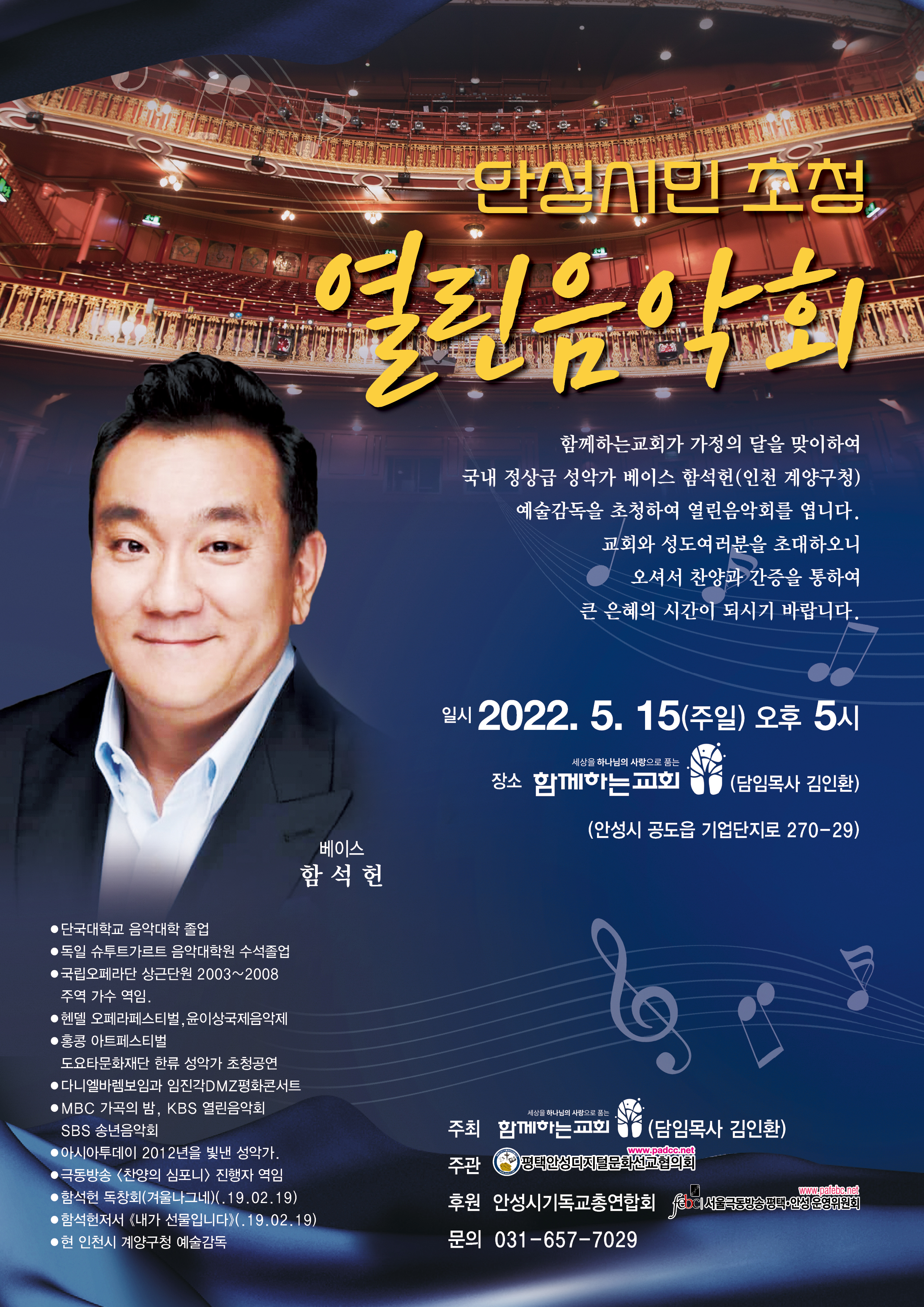 ¾È¼º½Ã¹Î ÃÊû ¿­¸°À½¾Çȸ°¡ ¿À´Â 15ÀÏ ¿ÀÈÄ 5½Ã °æ±âµµ ¾È¼º ÇÔ²²Çϴ±³È¸(´ãÀÓ¸ñ»ç ±èÀÎȯ)¿¡¼­ ¿­¸°´Ù.