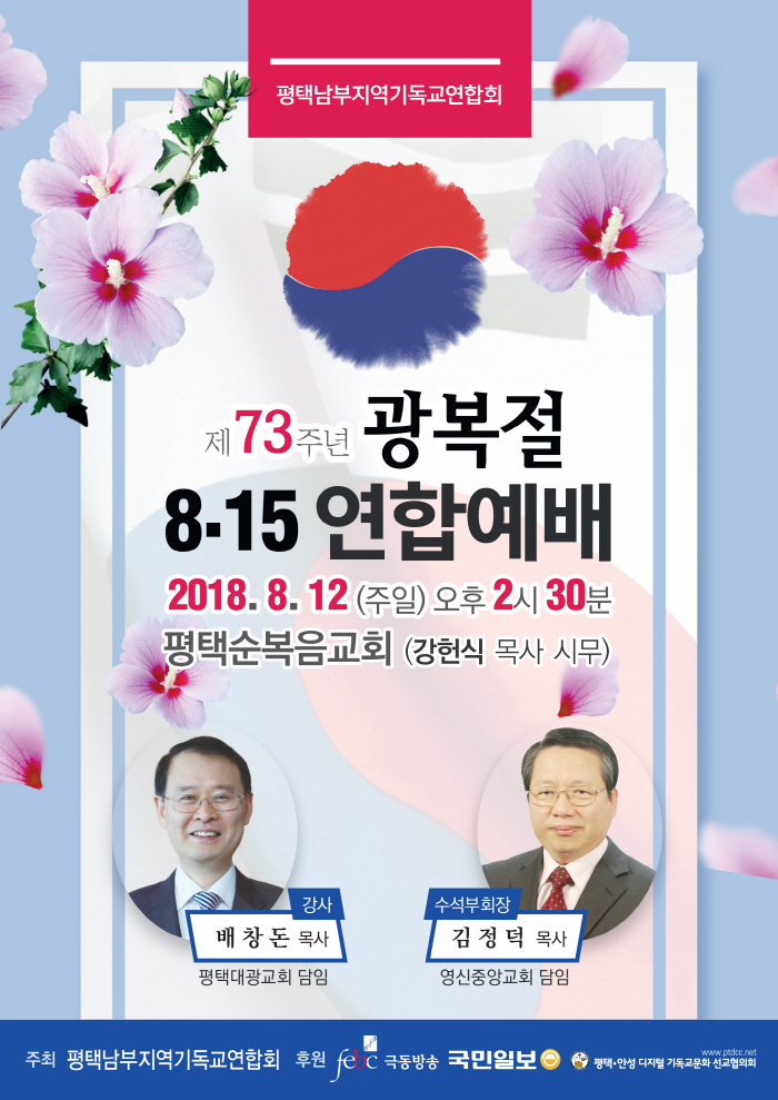 ÆòÅà ³²ºÎÁö¿ª±âµ¶±³¿¬ÇÕȸ(ȸÀå: ±è±ÍÇö ¸ñ»ç)´Â 8¿ù 12ÀÏ(ÀÏ) ¿ÀÈÄ 2½Ã 30ºÐ ÆòÅüøº¹À½±³È¸(°Çå½Ä ¸ñ»ç ½Ã¹«)¿¡¼ ÆòÅô뱤±³È¸ ¹èâµ· ¸ñ»ç¸¦ °»ç·Î ÃʺùÇØ ¡®Á¦73Áֳ⠱¤º¹Àý 8.15 ¿¬ÇÕ¿¹¹è¡¯¸¦ °®´Â´Ù.