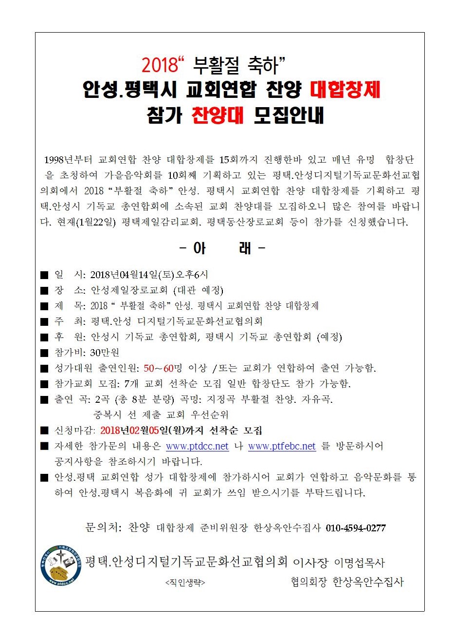 2018¡° ºÎȰÀý ÃàÇÏ¡±¾È¼º. ÆòÅýà ±³È¸¿¬ÇÕ Âù¾ç ´ëÇÕâÁ¦ Âü°¡¾È³»