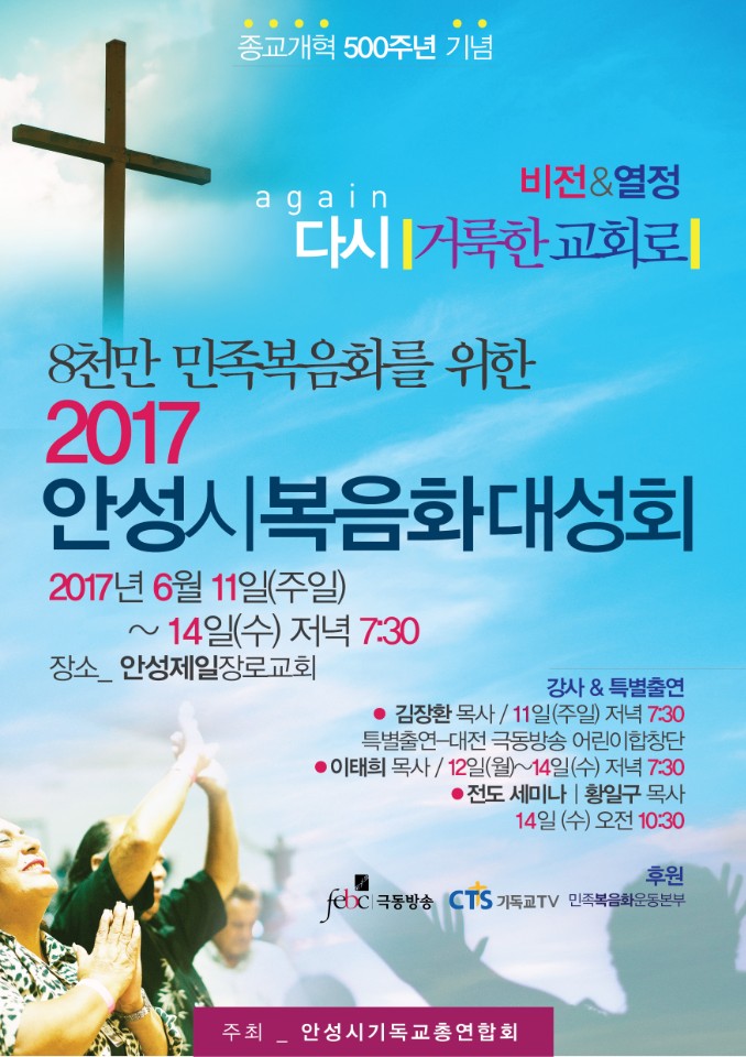 ¾È¼º½Ã ±âµ¶±³ ÃÑ¿¬ÇÕȸ(ÃÑȸÀå ¹Ú»ó±æ¸ñ»ç.»ç¹«ÃÑÀå ¼Û¿ëÇö¸ñ»ç)´Â ¿À´Â 2017³â6¿ù11ÀÏ(ÁÖÀÏ)ºÎÅÍ 6¿ù14ÀÏ(¼ö)±îÁö ¾È¼ºÀ̸¶Æ® ¾Õ¿¡ À§Ä¡ÇÑ ¾È¼ºÁ¦ÀÏÀå·Î±³È¸(´ãÀÓ¸ñ»ç ¾ç½Å)¿¡¼ ¾È¼º½Ã º¹À½È¸¦ À§ÇÑ ´ë ¼ºÈ¸¸¦ ¿¬´Ù.