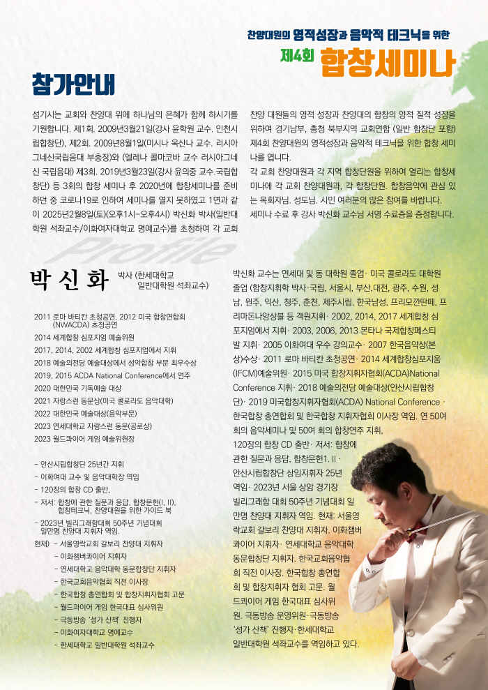 Áö³­ Á¦1ȸ. 2009³â3¿ù21ÀÏ(°­»ç À±Çпø ±³¼ö. ÀÎõ½Ã¸³ÇÕâ´Ü), Á¦2ȸ. 2009³â8¿ù1ÀÏ(¹Ì½Ã³ª ¿Á»ê³ª ±³¼ö. ·¯½Ã¾Æ±×³×½Å±¹¸³À½´ëºÎÃÑÀå)¿Í(¿¤·¹³ª Äݸ¶ÄÚ¹Ù ±³¼ö ·¯½Ã¾Æ±×³×½Å±¹¸³À½´ë) Á¦3ȸ. 2019³â3¿ù23ÀÏ(°­»ç À±ÀÇÁß ±³¼ö.±¹¸³ÇÕâ´Ü) µî 3ȸÀÇ ÇÕâ ¼¼¹Ì³ª ÈÄ ¿À´Â 2025³â2¿ù8ÀÏ(Åä)(¿ÀÈÄ1½Ã-¿ÀÈÄ4½Ã) ÇѼ¼´ëÇб³ ¹Ú½ÅÈ­ ¹Ú»ç´ÔÀ» ÃÊûÇÏ¿© °¢ ±³È¸ Âù¾ç ´ë¿øµéÀÇ ¿µÀû ¼ºÀå°ú Âù¾ç´ëÀÇ ÇÕâÀÇ ¾çÀû ÁúÀû ¼ºÀåÀ» À§ÇÏ¿© °æ±â³²ºÎ, ÃæÃ» ºÏºÎÁö¿ª ±³È¸¿¬ÇÕ (ÀÏ¹Ý ÇÕâ´Ü Æ÷ÇÔ) Á¦4ȸ Âù¾ç´ë¿øÀÇ ¿µÀû¼ºÀå°ú À½¾ÇÀû Å×Å©´ÐÀ» À§ÇÑ ÇÕâ ¼¼¹Ì³ª¸¦ ¿±´Ï´Ù.