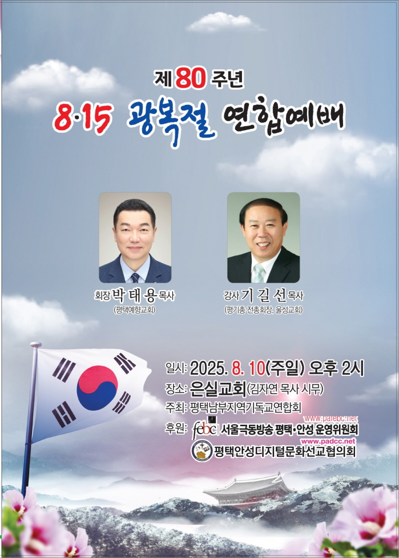 ÀÌ¾î Æ¯º°±âµµ¿¡¼­ ±èÁ¤´ö ¸ñ»ç(Àü ȸÀå ¿µ½ÅÁß¾Ó±³È¸)°¡ ±¹°¡ÀÇ ¾ÈÁ¤°ú ¹ø¿µÀ» À§ÇÏ¿© À±¿µÇÐ ¸ñ»ç(Àü ȸÀå ºñÀü´Ù»ç¶û±³È¸)°¡ ³²ºÏ ÆòÈ­ ÅëÀÏÀ» À§ÇÏ¿©, ±èżº ¸ñ»ç(ºÎȸÀå .Ǫ¸¥ÃÊÀ屳ȸ)°¡ ÆòÅýà º¹À½È­¿Í ¹ßÀüÀ» À§ÇÏ¿© °¢°¢ ±âµµÇÒ ¿¹Á¤ÀÌ¸ç ±èÀÚ¿¬ ¸ñ»ç(ÆòÅÃÀº½Ç±³È¸)ÀÇ Çå±Ý ±âµµ¿Í ±èżº ¸ñ»ç(ºÎȸÀå, Ǫ¸¥ÃÊÀ屳ȸ)ÀÇ ¼±Ã¢À¸·Î ±¤º¹Àý ³ë·¡ Á¦Ã¢ ¹× ¸¸¼¼ »ïâ ÈÄ ÀÌÁ¾¿ø ¸ñ»ç(Àü ȸÀå ÆòÅÃÀå·Î±³È¸)ÀÇ Ã൵·Î ±¤º¹Àý ¿¬ÇÕ¿¹¹è¸¦ ¸¶Ä¥ ¿¹Á¤ÀÌ´Ù.