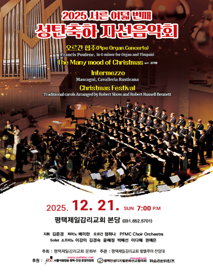 12¿ù 21ÀÏ(ÀÏ¿ÀÈÄ7½Ã ÆòÅÃÁ¦Àϰ¨¸®±³È¸ º»´ç¿¡¼­ ¿­¸®´Â ¼ºÅºÃàÇÏ ÀÚ¼±À½¾Çȸ´Â 1986³âºÎÅÍ ÇÏÀ̵ç Àü½Ã¹Ì»ç(Joseph Haydn¡¯s Tempore Belli miss), ¸ðÂ÷¸£Æ®ÀÇ ´ë°ü½Ä¹Ì»ç(Mozart Mass Coronation), ÇªÄ¡´ÏÀÇ ¿µ±¤ÀÇ ¹Ì»ç(Giacomo Puccini's Messa di Gloria) µîÀÇ ¹Ì»ç°îµé°ú ¼¼°è 3´ë ¿À¶óÅ丮¿À¶ó ºÒ¸®¿ì´Â ÇÀÇ ¿À¶óÅ丮¿À ¸Þ½Ã¾ß(Handel's oratorio Messiah), ÇÏÀ̵çÀÇ ¿À¶óÅ丮¿À õÁöâÁ¶(Hydan's oratorio Creation), ¼¼±âÀÇ ºÒÈĸíÀÛÀÎ ºÒ¸®¿ì´Â º£Å亥 ±³¾ç°î 9¹ø(Ludwing van Beethoven's Symphonie Nr.9 An die Freude), ºÎ¸£Å©³ÊÀÇ ¶¼µ¥¿ò(Anton Bruckner's Tedeum) µîÀÌ ¿¬ÁÖµÈ ÀÌ·¡ ¿ÃÇØ·Î 38³â°¸¦ ¸ÂÀÌÇÏ¸ç ´õ¿í ¿õÀåÇÏ°Ô ±âȹµÇ¾î ÆòÅÃÁö¿ª ±³È¸À½¾ÇÀÇ ÀüÅëÀ» À̾°í ÀÖ´Â Áö¹æµµ½Ã¿¡¼­´Â Á¢Çϱ⠾î·Á¿î À½¾Çȸ·Î Á¤ÆòÀÌ ³ª ÀÖ´Ù.