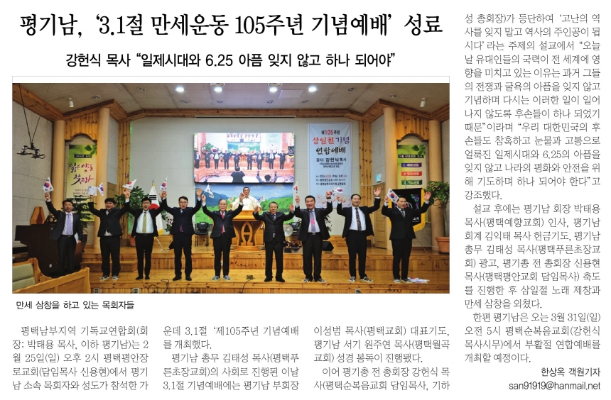 ÆòÅó²ºÎÁö¿ª ±âµ¶±³¿¬ÇÕȸ(ȸÀå: ¹ÚÅÂ¿ë ¸ñ»ç, ÀÌÇÏ Æò±â³²)´Â 2¿ù 25ÀÏ(ÀÏ) ¿ÀÈÄ 2½Ã ÆòÅÃÆò¾ÈÀå·Î±³È¸(´ãÀÓ¸ñ»ç ½Å¿ëÇö)¿¡¼­ Æò±â³² ¼Ò¼Ó ¸ñȸÀÚ¿Í ¼ºµµ°¡ Âü¼®ÇÑ °¡¿îµ¥ 3.1Àý ¡®Á¦105Áֳ⠱â³ä¿¹¹è¸¦ °³ÃÖÇß´Ù.