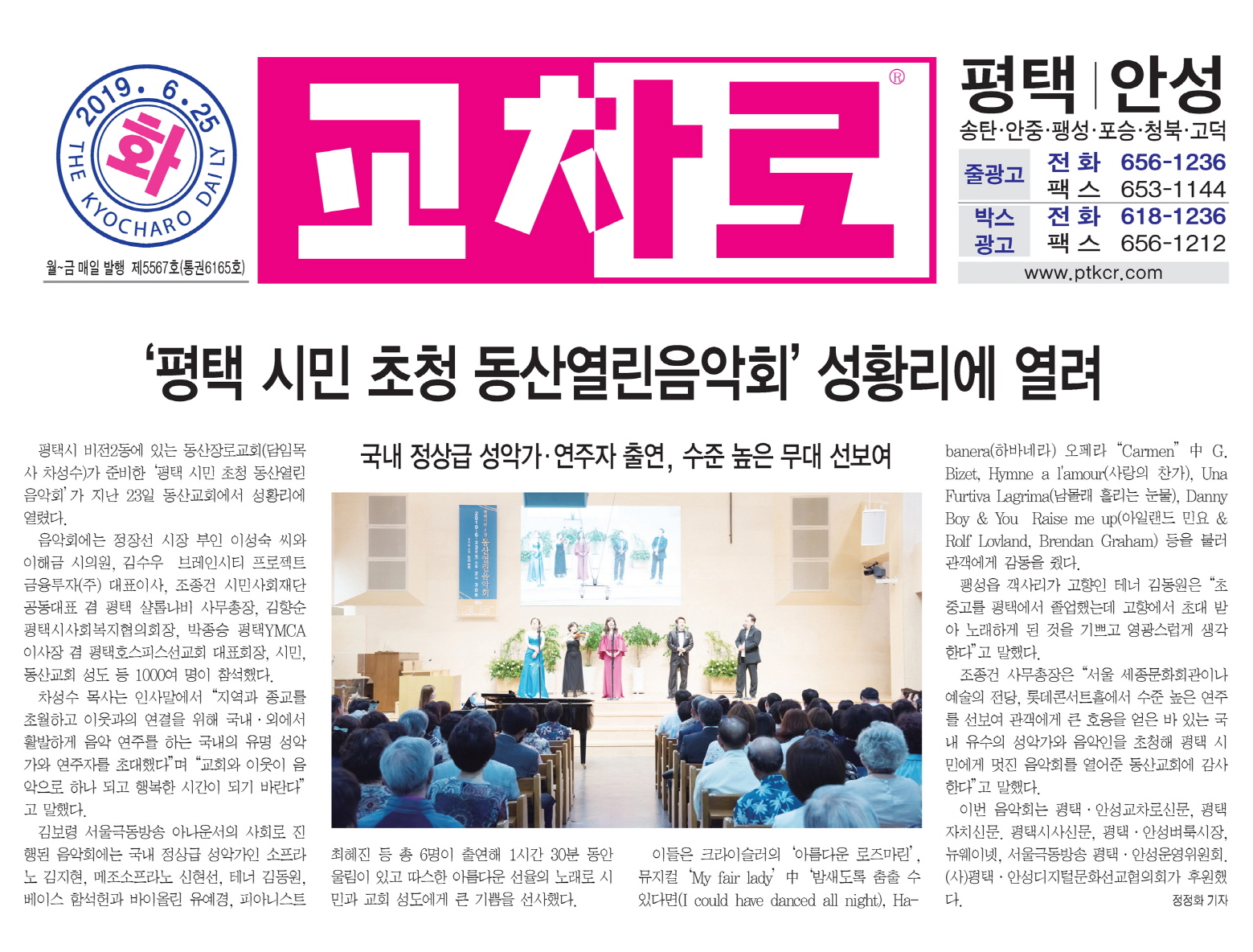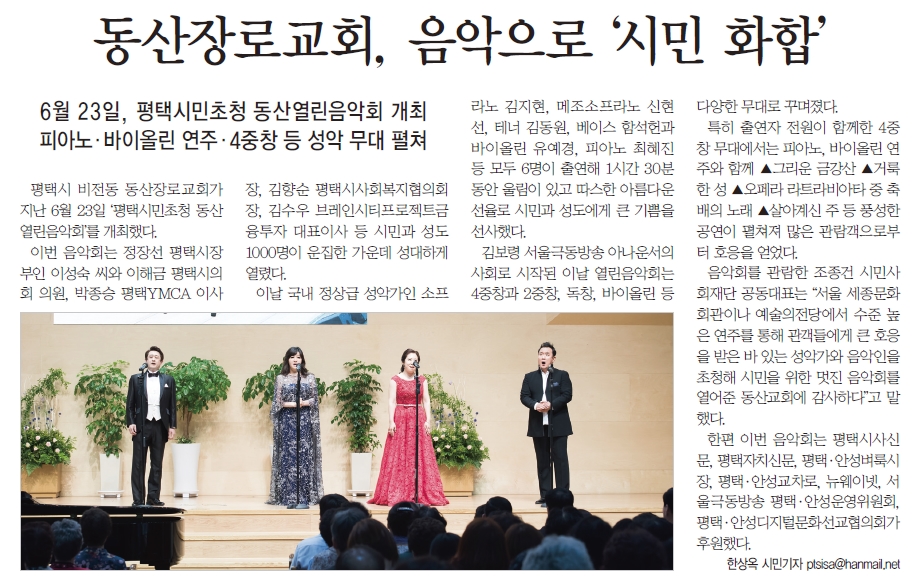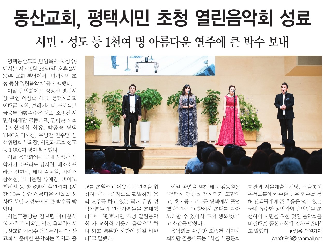 ÆòÅýà ºñÀüµ¿ µ¿»êÀå·Î±³È¸°¡ Áö³­ 6¿ù 23ÀÏ ¡®ÆòÅýùÎÃÊû µ¿»ê¿­¸°À½¾Çȸ¡¯¸¦ °³ÃÖÇß´Ù.À̹ø À½¾Çȸ´Â Á¤Àå¼± ÆòÅýÃÀå ºÎÀÎ À̼º¼÷ ¾¾¿Í ÀÌÇØ±Ý ÆòÅýÃÀÇȸ ÀÇ¿ø, ¹ÚÁ¾½Â ÆòÅÃYMCA ÀÌ»çÀå, ±èÇâ¼ø ÆòÅýûçȸº¹ÁöÇùÀÇȸÀå, ±è¼ö¿ì ºê·¹ÀÎ½ÃÆ¼ÇÁ·ÎÁ§Æ®±ÝÀ¶ÅõÀÚ ´ëÇ¥ÀÌ»ç µî ½Ã¹Î°ú ¼ºµµ 1000¸íÀÌ ¿îÁýÇÑ °¡¿îµ¥ ¼º´ëÇÏ°Ô ¿­·È´Ù.