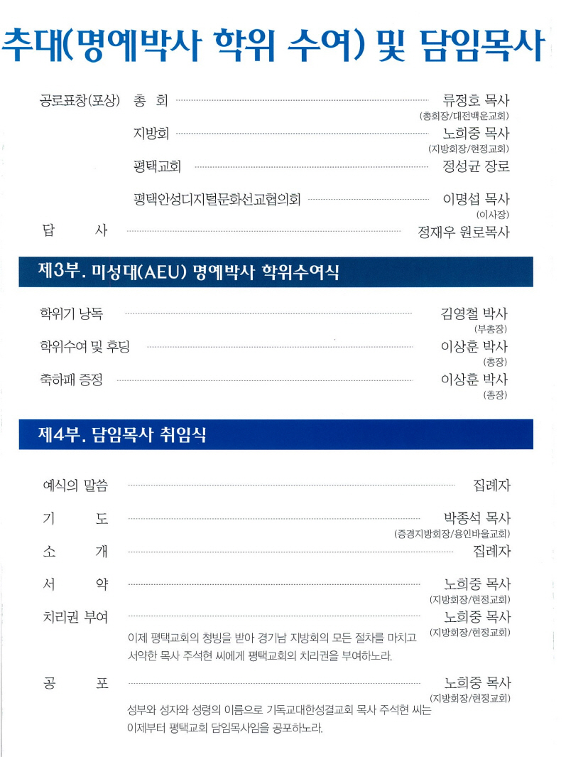 ÆòÅüº°á±³È¸´Â Áö³´Þ 29ÀÏ ¿ÀÈÄ ±³È¸¿¡¼ ÆòÅüº°á±³È¸ ¿ø·Î ¸ñ»ç Ãß´ë(¸í¿¹¹Ú»ç ÇÐÀ§¼ö¿©) ¹× ´ãÀÓ¸ñ»ç ÃëÀÓ¿¹½ÄÀ» ¿¾ú´Ù.