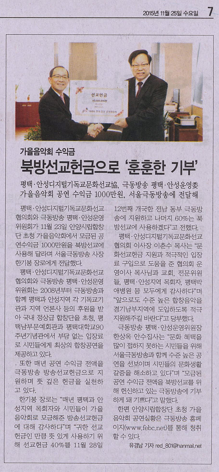 ÆòÅ᤾ȼºµðÁöÅб⵶±³¹®È­¼±±³ÇùÀÇȸ¿Í ±Øµ¿¹æ¼Û ÆòÅ᤾ȼº¿î¿µÀ§¿øÈ¸´Â 2008³âºÎÅÍ ±Øµ¿¹æ¼Û°ú ÇÔ²² ÆòÅðú ¾È¼ºÁö¿ª °¢ ±âµ¶±³±â°ü°ú Áö¿ª ¾ð·Ð»ç µîÀÇ ÈÄ¿øÀ» ¹Þ¾Æ ±¹³» Á¤»ó±Þ ÇÕâ´ÜÀ» ÃÊû, ÆòÅó²ºÎ¹®¿¹È¸°ü°ú ÆòÅôëÇб³90ÁÖ³â±â³ä°ü¿¡¼­ ºÎ´ã ¾ø´Â ÀÔÀå·á·Î ½Ã¹Îµé¿¡°Ô ÃÖ»óÀÇ ÇÕâ°ø¿¬À» Á¦°øÇϰí ÀÖ´Ù. ¶ÇÇÑ ¸Å³â °ø¿¬ ¼öÀÍ±Ý Àü¾×À» ±Øµ¿¹æ¼Û ¹æ¼Û¼±±³Çå±ÝÀ¸·Î Áö¿øÇÏ¸ç ¶æ ±íÀº Çå±ÝÀ» ½ÇõÇϰí ÀÖ´Ù.