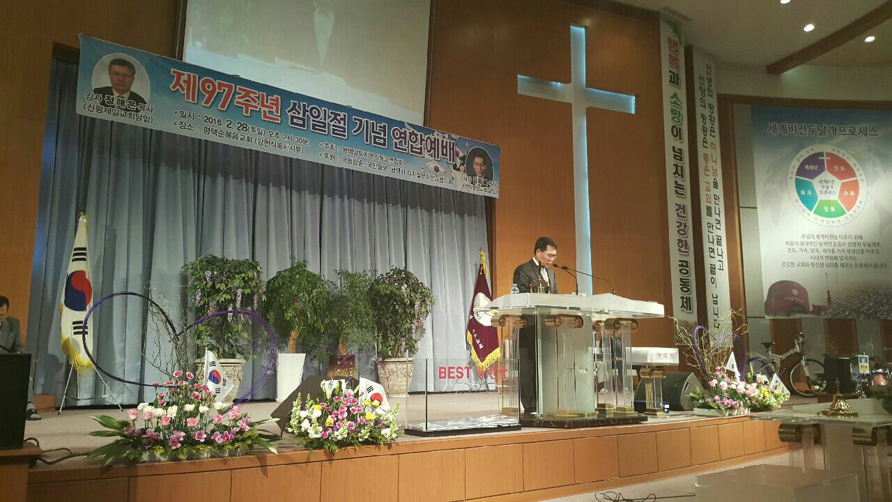 ³²±â·Ã Á÷ÀüȸÀå Á¤ÇØÀº ¸ñ»ç´Â <±âµ¶±³¿Í 3.1Àý ¿îµ¿>À̶ó´Â ¼³±³¸¦ ÅëÇØ ¡°3.1¿îµ¿Àº Á¾±³¿Í À̳ä°ú °èÃþÀ» ¶Ù¾î³Ñ¾î ¿ì¸® ¹ÎÁ·ÀÇ ÀÚÁÖµ¶¸³À» À§ÇØ 1919³â 3¿ù1ÀÏ Á¤¿À¸¦ ±âÇÏ¿© ÀÏÁ¦ÀÇ ¾Ð¹Ú¿¡ Ç×°Å, Àü ¼¼°è¿¡ ¹ÎÁ·ÀÇ ÀÚÁÖµ¶¸³À» ¼±¾ðÇÏ°í ¿Â ¹ÎÁ·ÀÌ Ãѱȱâ ÇÏ¿© ÆòÈ­Àû ½ÃÀ§¸¦ Àü°³ Çß´Ù¡±¸ç ¡°´ç½Ã ¹ÎÁ·´ëÇ¥ 33ÀÎ Áß Àý¹Ý¿¡ °¡±î¿î 16¸íÀÇ ±âµ¶ÀεéÀÌ ¹ü¹ÎÁ·ÀûÀÎ »ïÀϿÀ» ÁÖµµÇÏ¿´°í, Çѱ¹±³È¸´Â ÀÌ·¯ÇÑ ¹ÙÅÁ À§¿¡¼­ ±³È¸ ºÎÈï°ú ¼ºÀåÀ» ÀÌ·ê ¼ö ÀÖ¾ú´Ù. ¿ì¸® ¼ºµµµéµµ ¼±Á¶µéÀÇ Èñ»ýÁ¤½ÅÀ» º»¹Þ¾Æ ³ª¶ó¿Í ¹ÎÁ·À» À§ÇØ ±âµµÇÏÀÚ¡±°í ¸»Çß´Ù.
