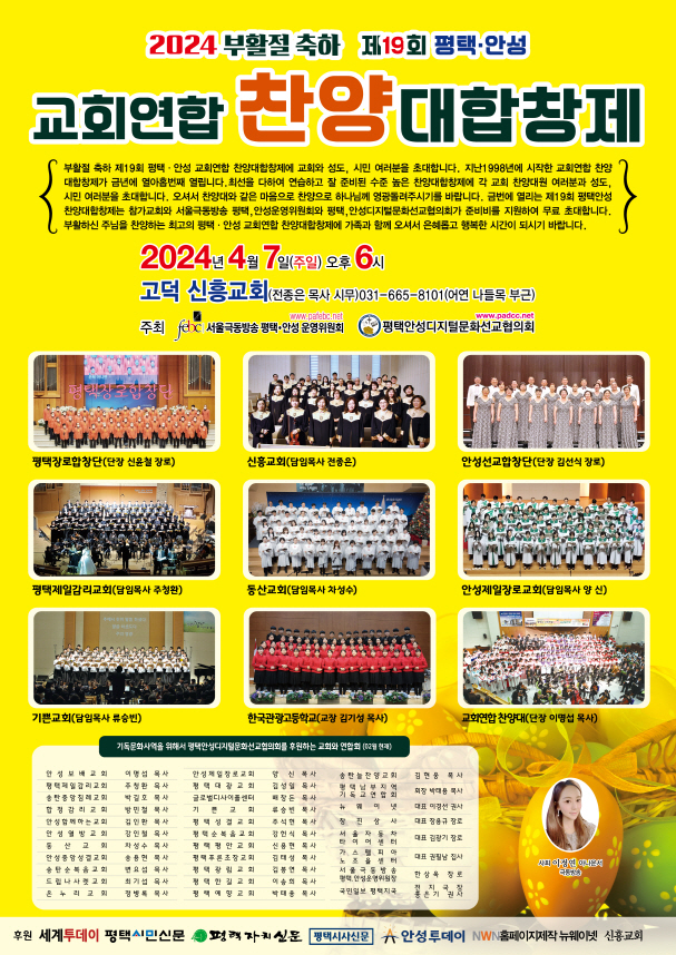 ÇÑÆí ±Ý¹ø¿¡ ¿¸®´Â 2024¡°ºÎȰÀý ÃàÇÏ Á¦19ȸ ¡®ÆòÅÃ.¾È¼º ±³È¸¿¬ÇÕ Âù¾ç´ëÇÕâÁ¦´Â ÇÑ»ó¿Á Àå·Î(ÁغñÀ§¿øÀå)°¡ 1998³âºÎÅÍ ±âȹÇÏ¿© ±×ÇØ 1998³â11¿ù28ÀÏ(Åä)Àú³á7½Ã ÆòÅÃÁ¦Àϰ¨¸®±³È¸¿¡¼ Á¦1ȸ Âù¾ç´ëÇÕâÁ¦¸¦ ½ÃÀÛÀ¸·Î 2023³â 4¿ù16ÀÏ(ÁÖÀÏ)¿ÀÈÄ6½Ã ¾È¼ºÁ¦ÀÏÀå·Î±³È¸(¾ç ½Å¸ñ»ç ½Ã¹«)¿¡¼ Á¦18ȸ Âù¾ç´ëÇÕâÁ¦¿¡ ÀÌ¾î ±Ý¹ø¿¡ ¿¾ÆÈ©¹øÂ°·Î °í´ö¸é ½ÅÈﱳȸ¿¡¼ Âù¾ç´ëÇÕâÁ¦·Î °æ±â ³²ºÎÁö¿ª ÃÖ°íÀÇ ¼öÁسôÀº ÇÕâÀ½¾Çȸ¸¦ ÁغñÇϰí ÀÖ´Ù.